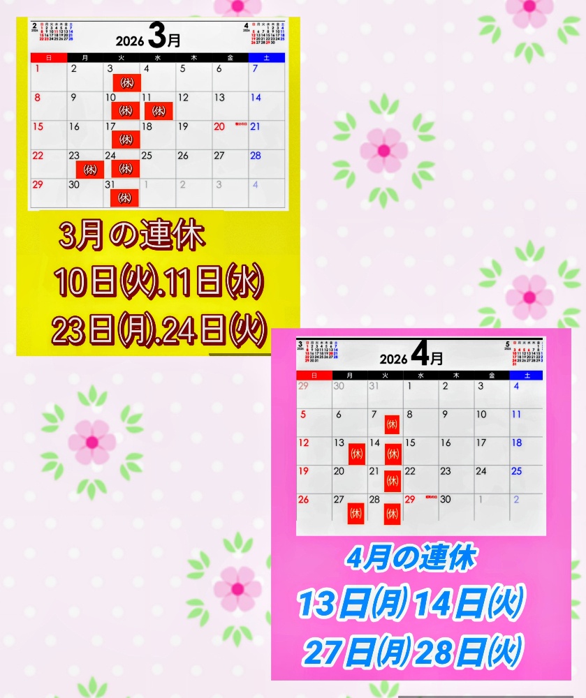 3月の連休10日㈫.11日㈬23日㈪.24日㈫⚪⚪⚪⚪⚪⚪⚪⚪⚪⚪4月の連休13日㈪.14日㈫27日㈪.28日㈫宜しくお願い致します。